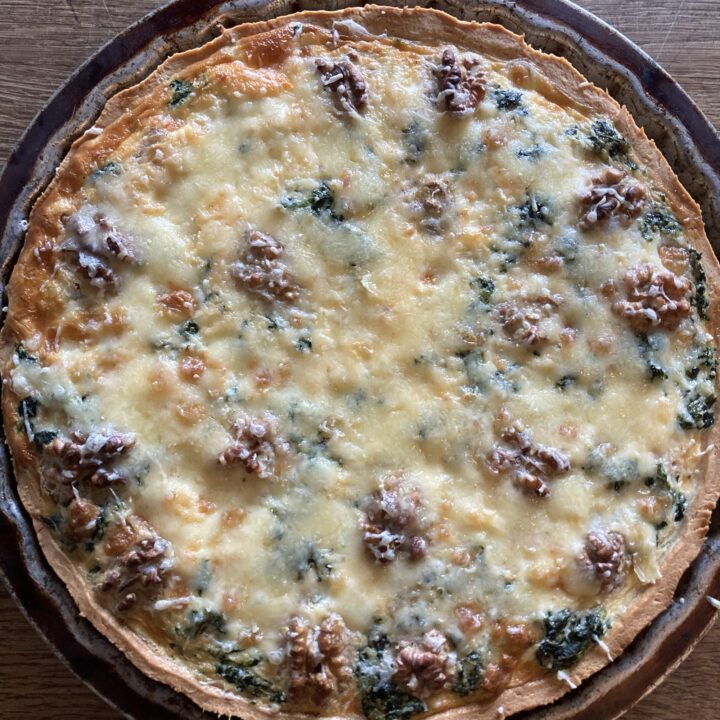 - makaron fusili ze szpinakiem i gorgonzolą, posypany serem grana padano i prażonym orzechami włoskimi