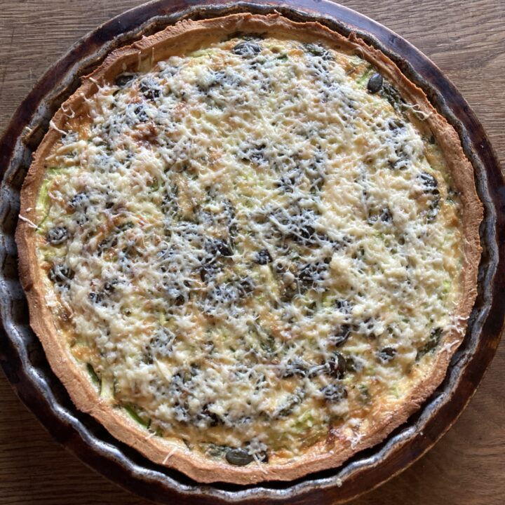 - tarta z boczniakami, pikantnym salami z Kalabrii i serem bursztyn.