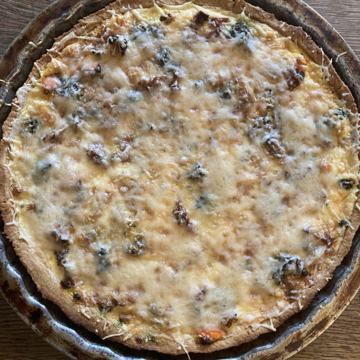 - tarta z pieczoną dynią hokkaido, pesto z bazylii, suszonymi pomidorami i serem grana padano.