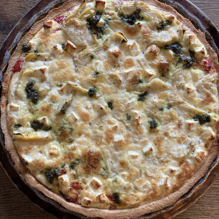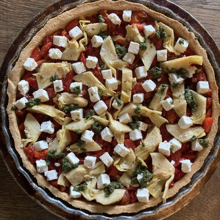 - tarta z pieczoną papryką, karczochami, fetą i pesto.