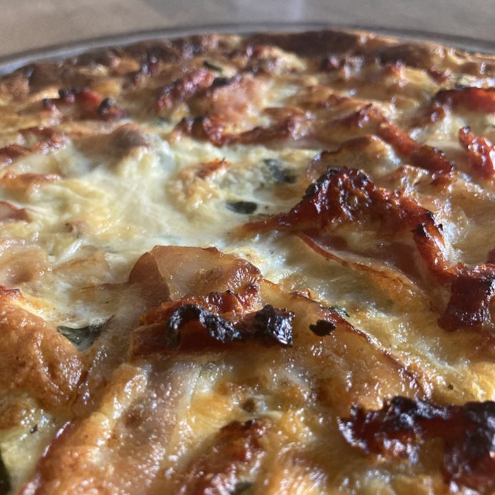 - tarta z cukinią, wędzonym boczkiem, mozzarellą fior di latte i suszonymi pomidorami.