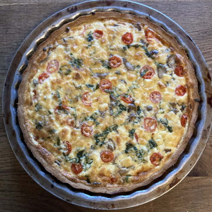 - tarta z boczniakami, cheddarem, pomidorkami cherry, oliwą truflową i bazylią.
