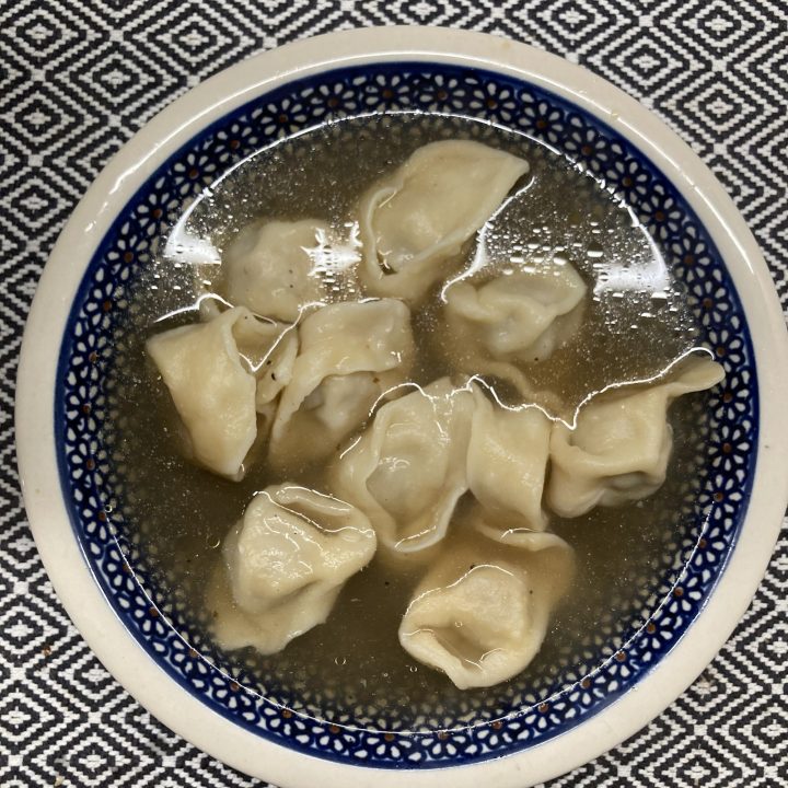 Żeby uczynić zadość naszej domowej świątecznej tradycji,w tym roku też przygotowaliśmy zupę. Nie szukaliśmy inspiracji na Dalekim Wschodzie, tylko poszliśmy w coś bardziej swojskiego. Wczoraj w ostatni dzień pracy gotowaliśmy w Nowym Bufecie przez pięć godzin rosół z trzech rodzajów mięs. A po pracy wzięliśmy się raźno za przygotowanie kołdunów. W rezultacie spożywamy pyszny rosół z mięsnymi kołdunami w kształcie uszek.