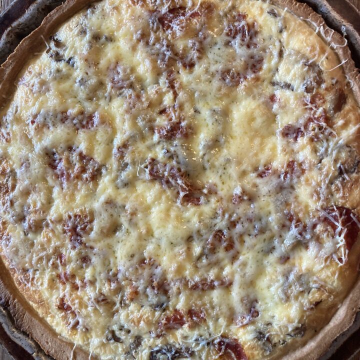 - tarta z boczniakami, pikantnym salami z Kalabrii i serem bursztyn.