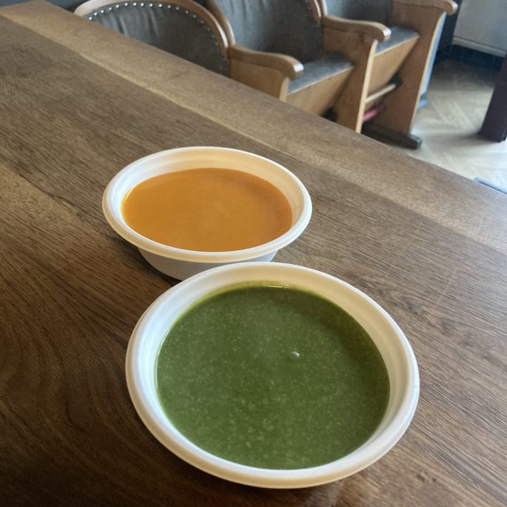 Ilość pracy, którą trzeba włożyć w to, żeby mieć do zaoferowania dwie zupy i dwie lancze bywa przytłaczająca. Analogicznie – ilość warzyw, których użyliśmy do przygotowania wszystkich propozycji na dziś, również może przyprawiać o zawrót głowy. Jest ich mnóstwo i są kolorowe. Pokuszę się o wymienienie WSZYSTKICH: cebula, czosnek, pomidory, cukinia, bakłażan, dynia, pory, soczewicą, ciecierzyca, seler, marchewka, szpinak. Plus bazylia, tymianek, kolendra, suszone morele, orzechy nerkowca i pekan. Być może coś pominęłam, ale i tak jest godnie. A jak kolorowo jest w zupach, widzicie na zdjęciu.