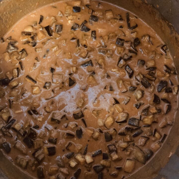- curry z kurczaka z pieczonym bakłażanem, masłem orzechowym, pomidorami i mleczkiem kokosowym – to jest to curry o wyjątkowym smaku i kremowości uzyskanej dzięki masłu orzechowemu