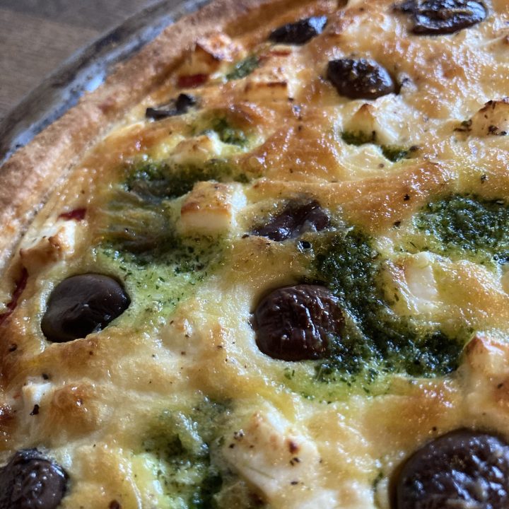 - tarta z pieczoną papryką, fetą, oliwkami liguryjskimi i pesto pietruszkowym.