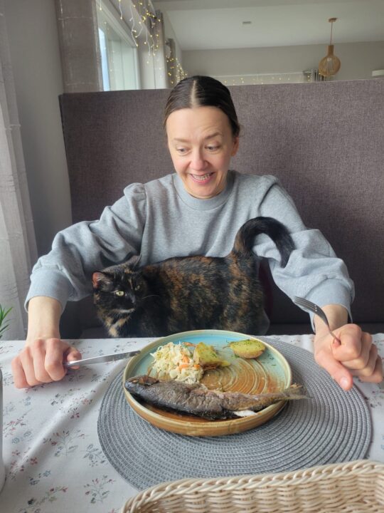 A jak widzicie na fotografii – miejscową kotka z pensjonatu jest bardzo przyjacielska. Ale głównie, jeśli chodzi o,pstrąga na talerzu. Na pewno jest jakoś spokrewniona z naszą Starą, która przejawia szereg tożsamych zachowań.