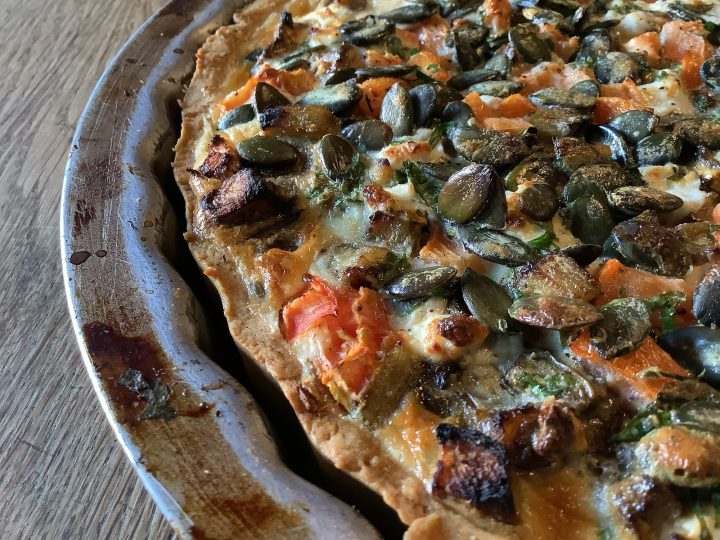 - tarta z pieczonym bakłażanem, pomidorami, kozim serem i pestkami dyni.