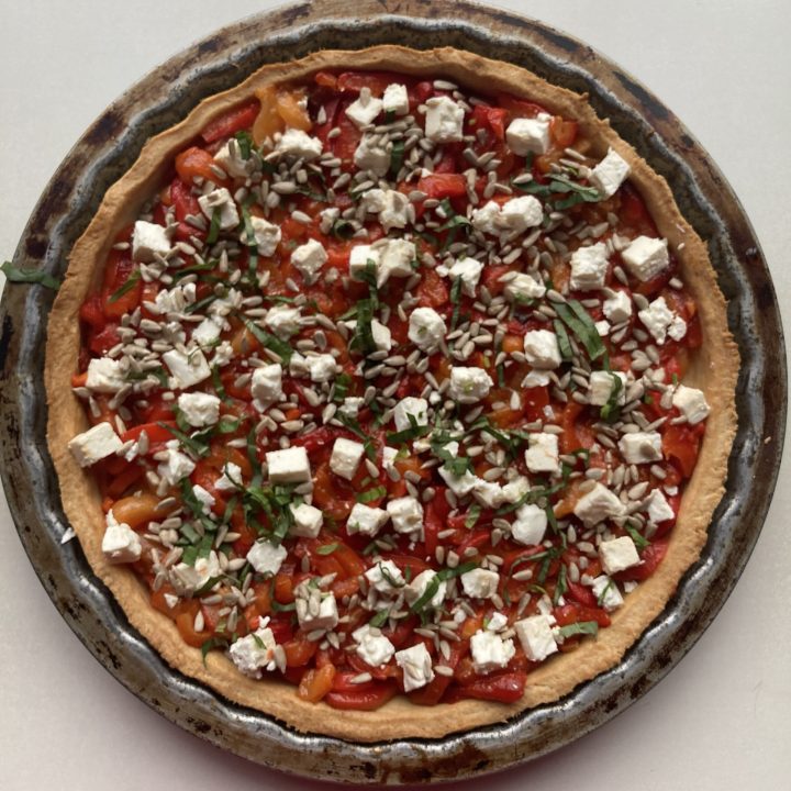 - tarta z pieczoną papryką, fetą i słonecznikiem.