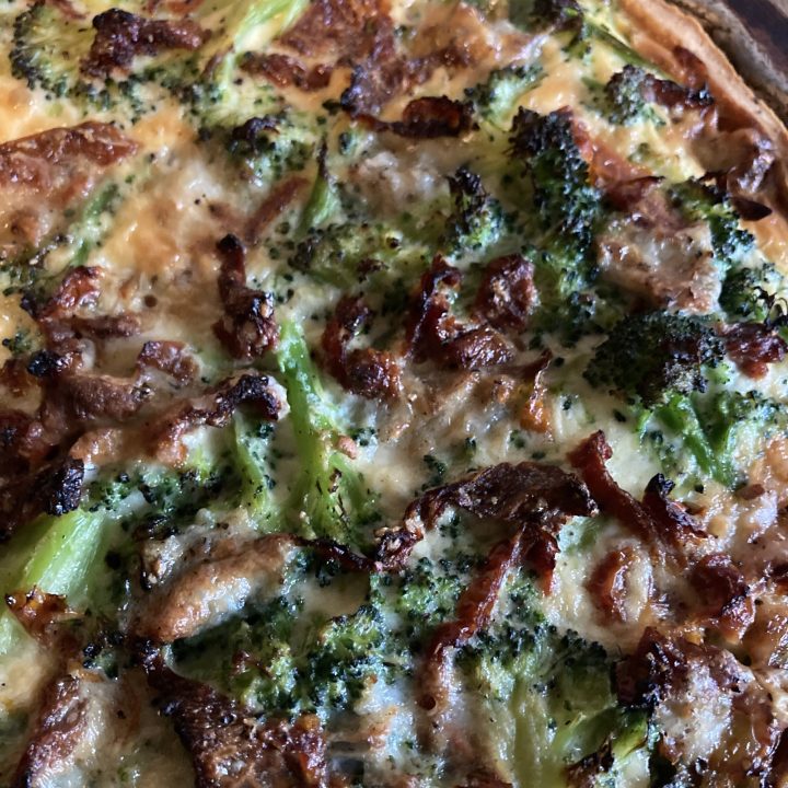 - tarta z pieczoną papryką, fetą, oliwkami liguryjskimi i pesto pietruszkowym.