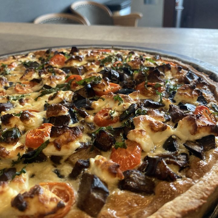- tarta z bakłażanem, kozim serem i pomidorkami.