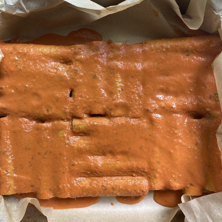 - makaron cannelloni czyli rurki nadziewane szpinakiem, ricottą i mozzarellą fior di latte, zapiekane w sosie rosè